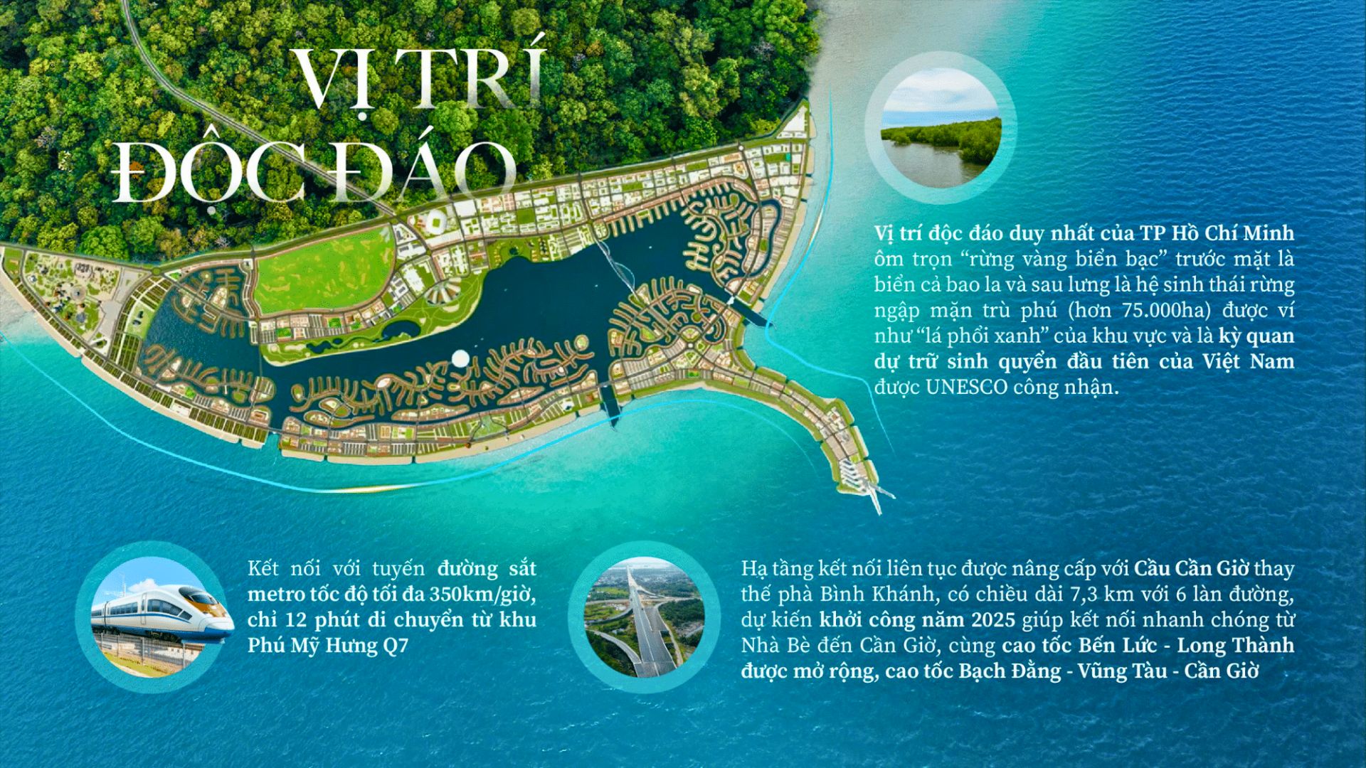 - Toạ lạc tại Cần Giờ – cửa ngõ hướng thẳng ra Biển Đông, liền kề trung tâm TP.HCM.